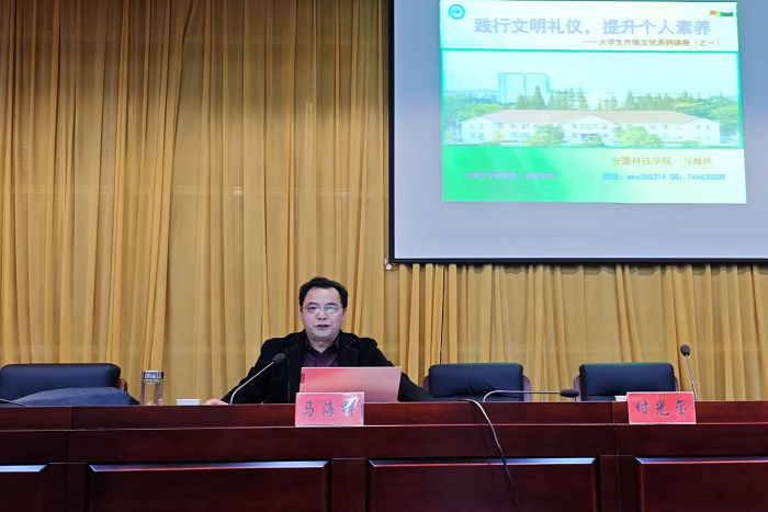 马海祥以“践行文明礼仪,提升个人素养”为主题,围绕“礼仪是我中华民族的传统美德”“文明礼仪在现代社会极为重要”“践行文明礼仪首先从校园开始”等三方面内容给同学们呈现了一场生动精彩、内涵丰富的专题讲座。他强调,礼仪是一个人内在素养和外在形象的体现,是社会文明进步的载体,大学生作为接受高等教育、传承优秀文化、担当民族复兴大任的群体更应该将文明礼仪内化为观念、外化为行动,做到奉礼待人,塑造新时代大学生形象。同时,他结合现代大学生的特点,运用大量的图片、生动的事例等信息,向大家详细介绍了在各个场景下学生仪容仪表和言谈举止方面的规范和要求。讲座最后,马海祥向大家提出了提升大学生文明素养五大标准和建议,一是大方得体的穿着打扮;二是高尚雅致的情趣爱好;三是健康良好的生活习惯;四是谦恭优雅的言谈举止;五是丰富深厚的文化底蕴。