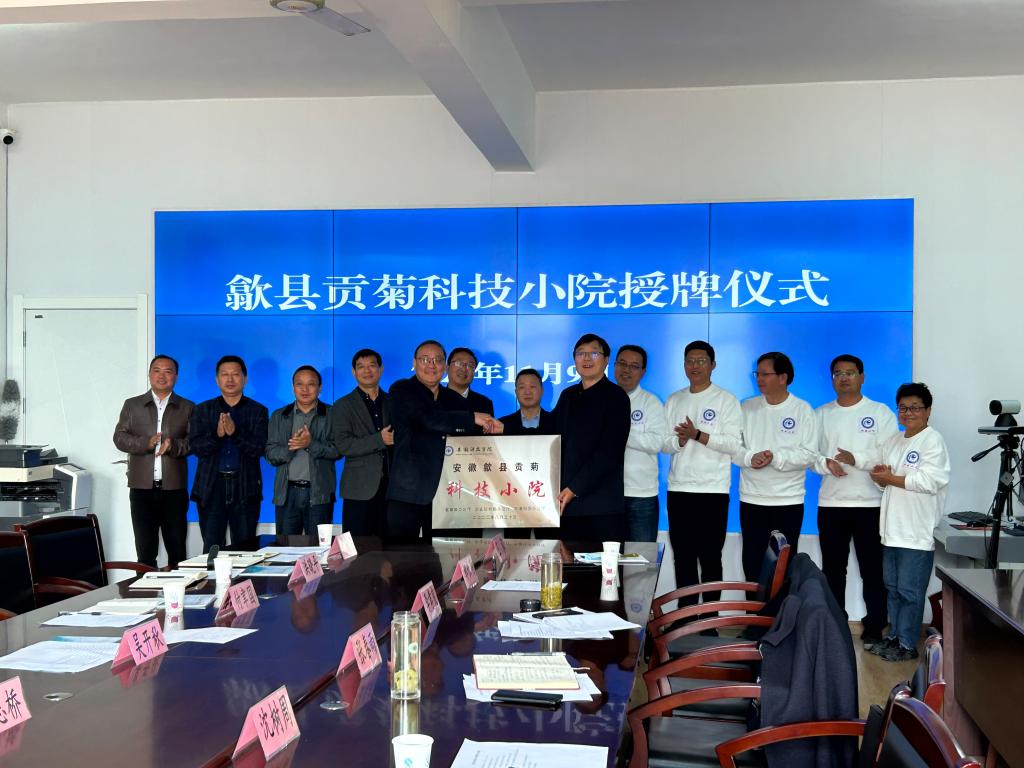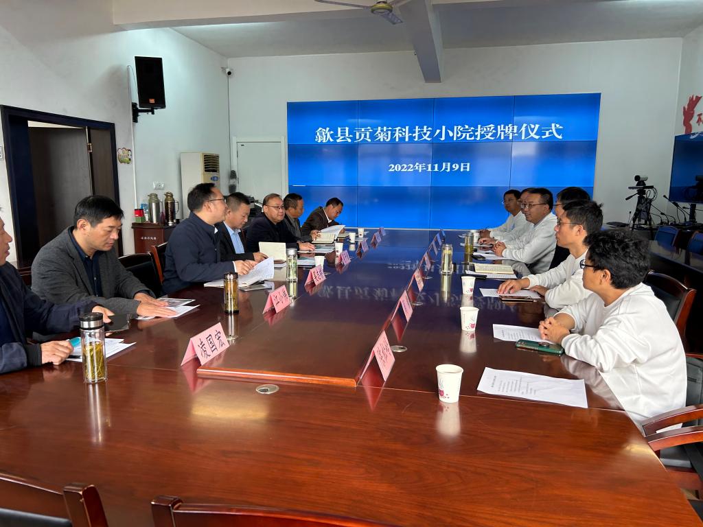 授牌仪式前,校地双方进行了座谈交流。张春雨介绍了学校的办学特色以及学科专业、师资队伍建设及人才培养等方面取得的成果。学校办学历史悠久,多年来扎根农业、农村和农民中,为地区农业发展作出了重大贡献。张春雨指出,歙县“贡菊科技小院”是由国家三部委(教育部、农业农村部、中国科协)支持建设,星空官方网站_星空(中国)股份有限公司,通过派驻研究生、研究生导师,解决歙县贡菊产业发展中的瓶颈问题,推广农业新技术,为歙县贡菊产业发展作贡献。