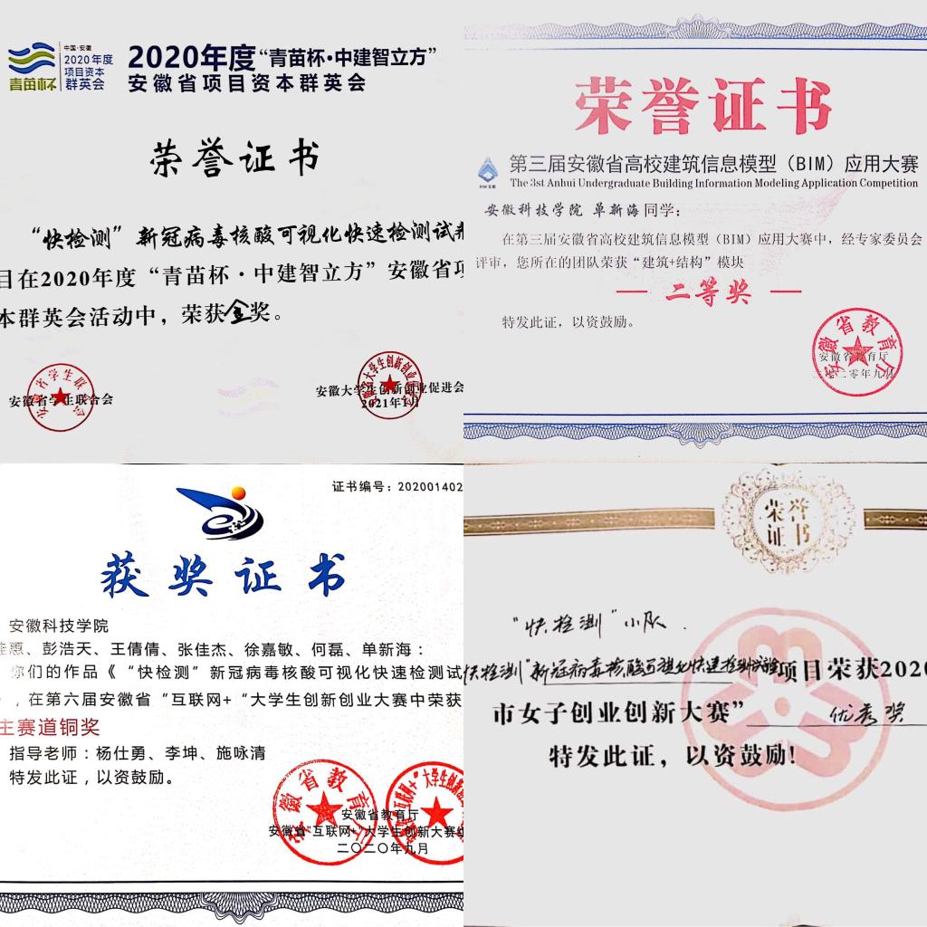 在科技研究方面,单新海与生命与健康科学学院师生合作“快检测”新冠病毒核酸可视化快速检测试剂盒项目,获2020年青苗杯安徽省资本群英会省金奖、第六届互联网+创新创业大赛省铜奖和蚌埠市女子创新创业大赛市优秀奖;更是于2021年1月7日参加合肥国家大学科技园创业大学举办的2021年安徽省青年创业实战训练营。