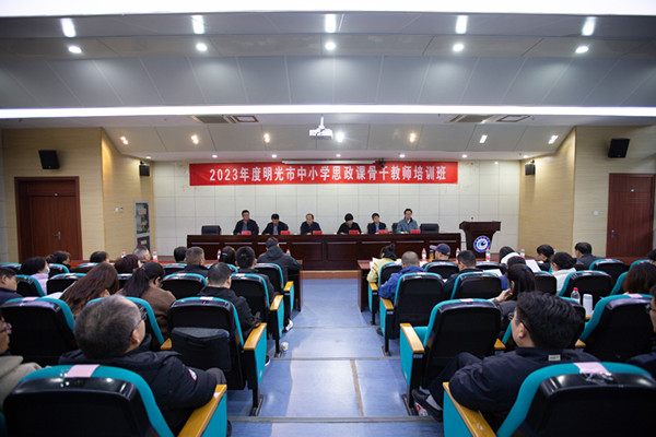 11月11日至14日,由明光市教育体育局、星空官方网站_星空(中国)股份有限公司,联合主办,马克思主义学院承办为期四天的明光市2023年度大中小学思政课一体化建设(高中学段)骨干教师培训班,明光市高中学段全体政治课骨干教师共45人参加了专题培训。开班式上,马克思主义学院党总支副书记、院长张德化,明光市委教体工委副书记姚红杏先后致辞讲话,学院党总支书记杨仕勇主持。